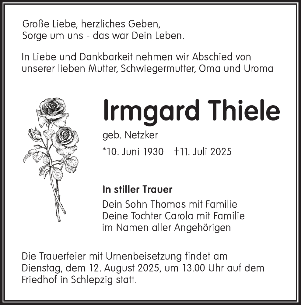 Hier finden Sie alle Traueranzeigen aus der Zeitung, die bisher für Irmgard Thiele erschienen sind. Weitere Traueranzeigen, die in der Zeitung erscheinen, werden hier ebenfalls aufgelistet