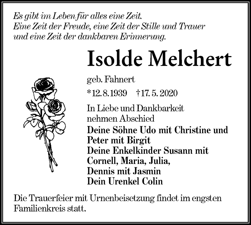 Hier finden Sie alle Traueranzeigen aus der Zeitung, die bisher für Isolde Melchert erschienen sind. Weitere Traueranzeigen, die in der Zeitung erscheinen, werden hier ebenfalls aufgelistet