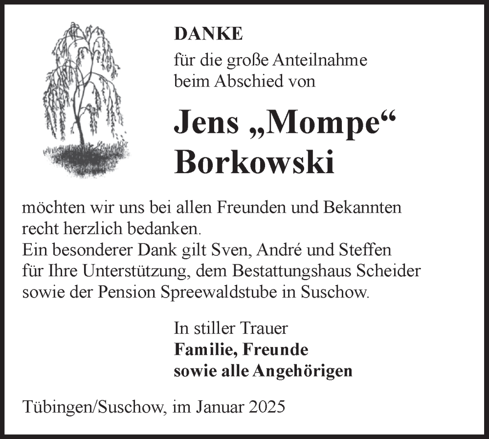 Hier finden Sie alle Traueranzeigen aus der Zeitung, die bisher für Jens Borkowski erschienen sind. Weitere Traueranzeigen, die in der Zeitung erscheinen, werden hier ebenfalls aufgelistet