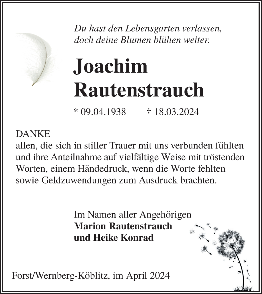 Hier finden Sie alle Traueranzeigen aus der Zeitung, die bisher für Joachim Rautenstrauch erschienen sind. Weitere Traueranzeigen, die in der Zeitung erscheinen, werden hier ebenfalls aufgelistet