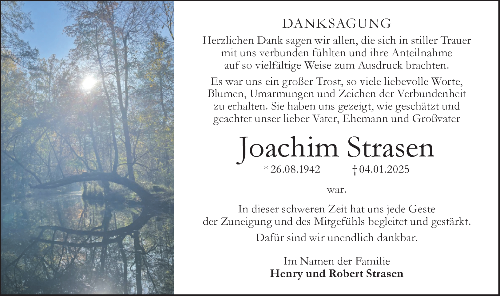 Hier finden Sie alle Traueranzeigen aus der Zeitung, die bisher für Joachim Strasen erschienen sind. Weitere Traueranzeigen, die in der Zeitung erscheinen, werden hier ebenfalls aufgelistet