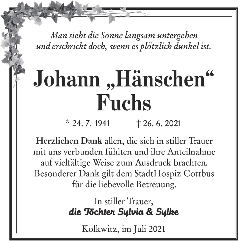 Hier finden Sie alle Traueranzeigen aus der Zeitung, die bisher für Johann Fuchs erschienen sind. Weitere Traueranzeigen, die in der Zeitung erscheinen, werden hier ebenfalls aufgelistet
