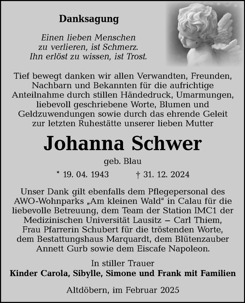 Hier finden Sie alle Traueranzeigen aus der Zeitung, die bisher für Johanna Schwer erschienen sind. Weitere Traueranzeigen, die in der Zeitung erscheinen, werden hier ebenfalls aufgelistet