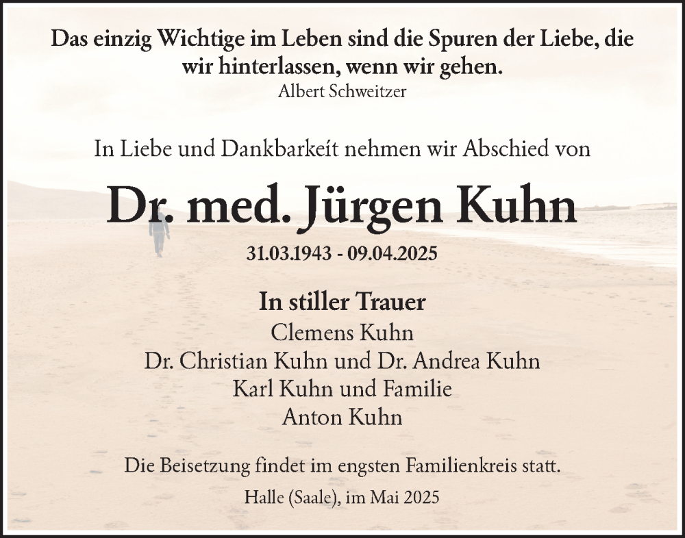 Hier finden Sie alle Traueranzeigen aus der Zeitung, die bisher für Jürgen Kuhn erschienen sind. Weitere Traueranzeigen, die in der Zeitung erscheinen, werden hier ebenfalls aufgelistet
