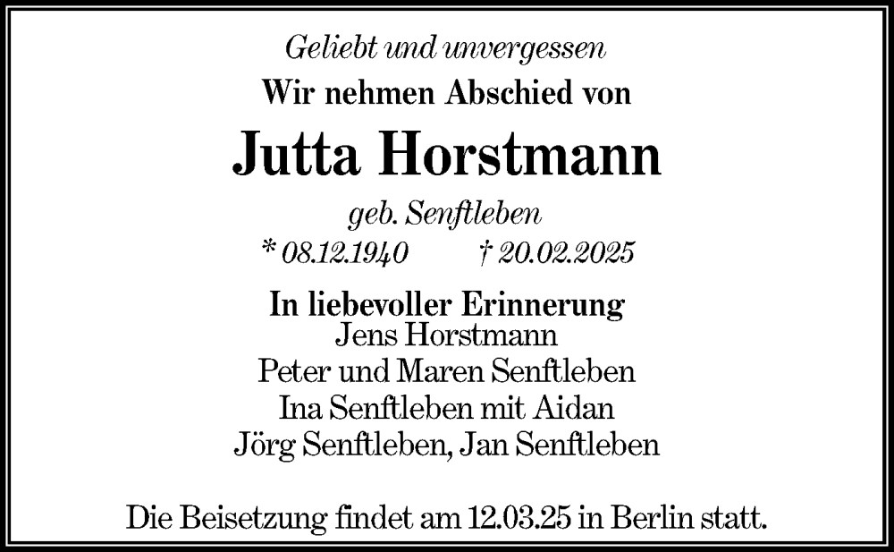 Hier finden Sie alle Traueranzeigen aus der Zeitung, die bisher für Jutta Horstmann erschienen sind. Weitere Traueranzeigen, die in der Zeitung erscheinen, werden hier ebenfalls aufgelistet
