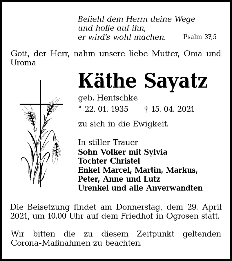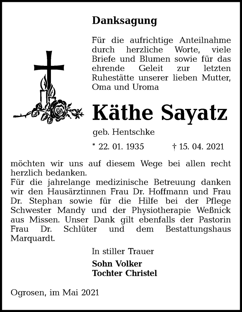 Hier finden Sie alle Traueranzeigen aus der Zeitung, die bisher für Käthe Sayatz erschienen sind. Weitere Traueranzeigen, die in der Zeitung erscheinen, werden hier ebenfalls aufgelistet
