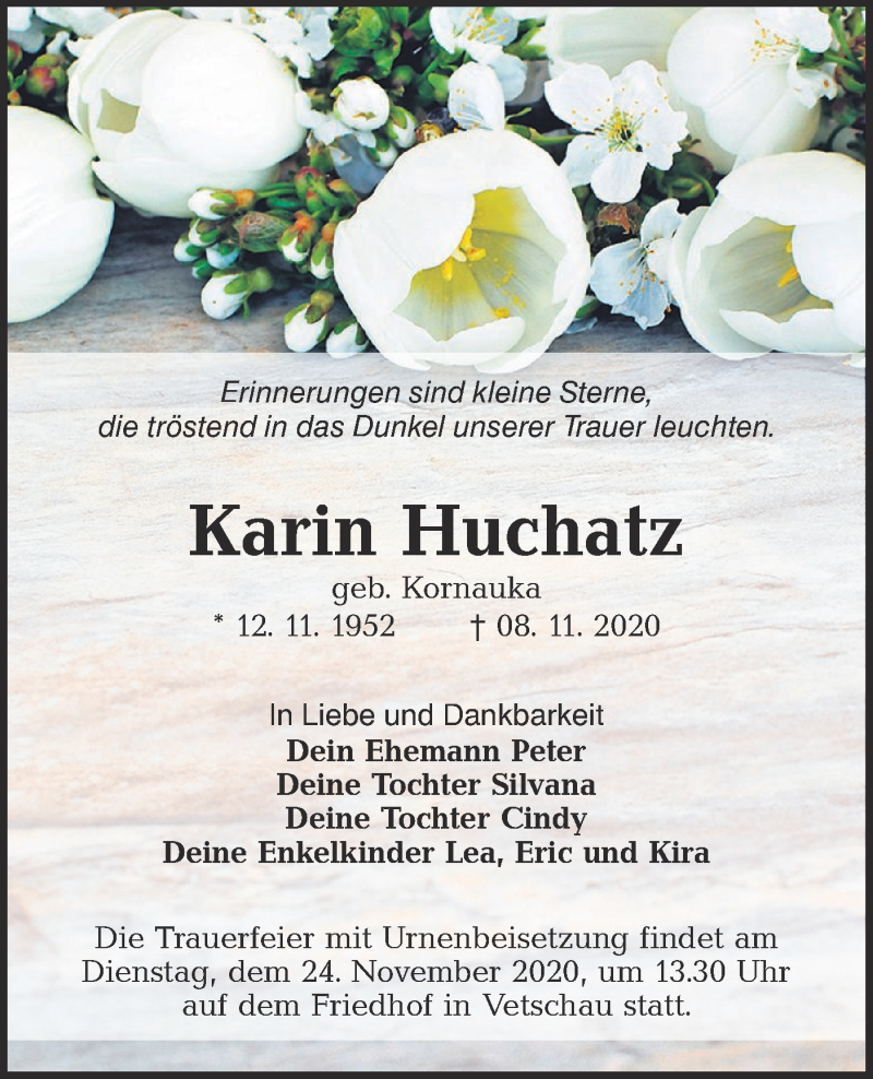 Hier finden Sie alle Traueranzeigen aus der Zeitung, die bisher für Karin Huchatz erschienen sind. Weitere Traueranzeigen, die in der Zeitung erscheinen, werden hier ebenfalls aufgelistet