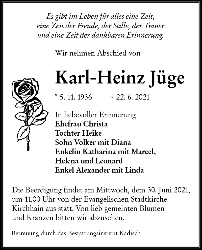 Hier finden Sie alle Traueranzeigen aus der Zeitung, die bisher für Karl-Heinz Jüge erschienen sind. Weitere Traueranzeigen, die in der Zeitung erscheinen, werden hier ebenfalls aufgelistet