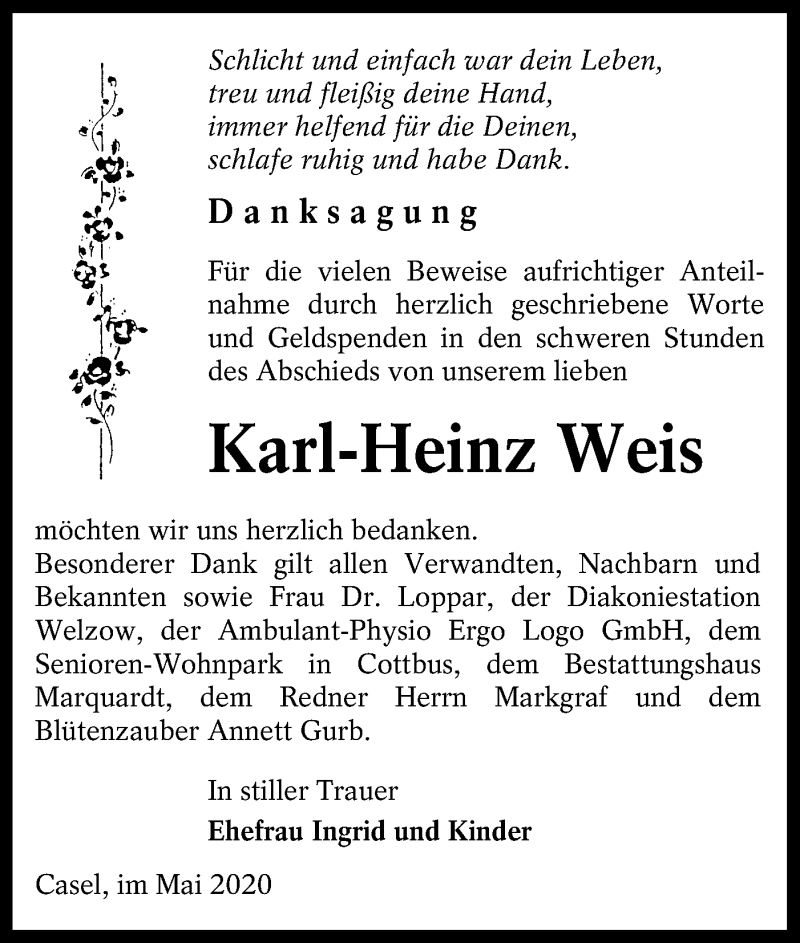 Hier finden Sie alle Traueranzeigen aus der Zeitung, die bisher für Karl-Heinz Weis erschienen sind. Weitere Traueranzeigen, die in der Zeitung erscheinen, werden hier ebenfalls aufgelistet
