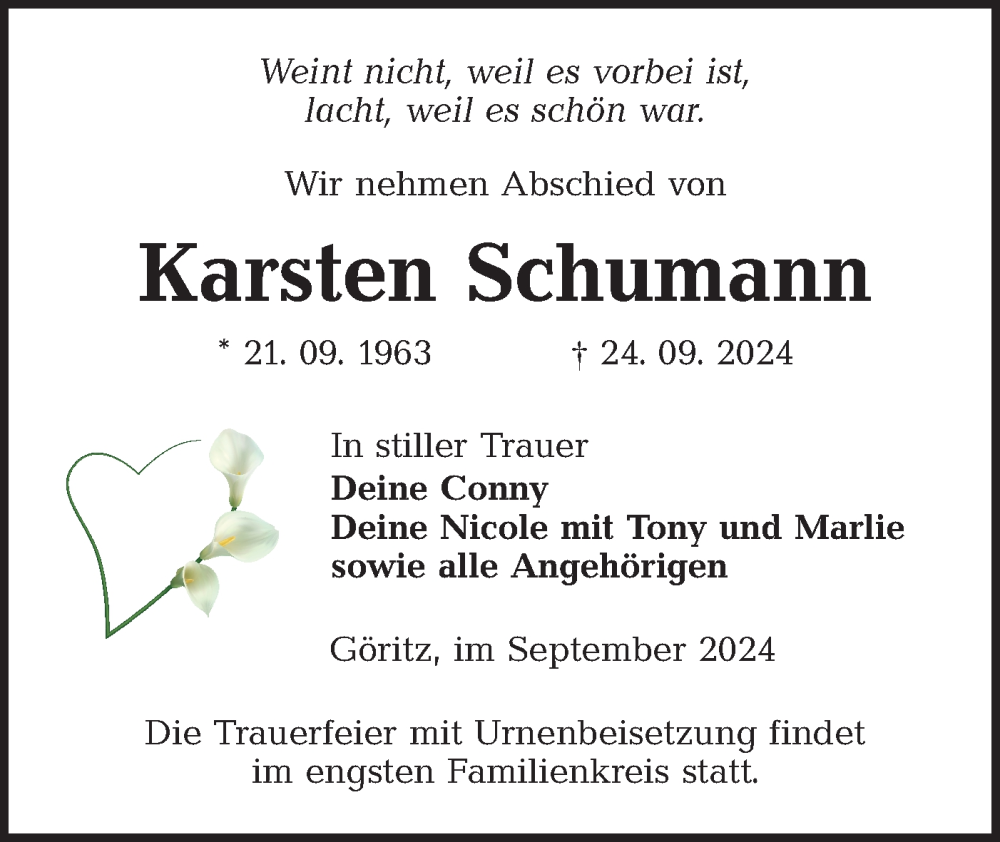 Hier finden Sie alle Traueranzeigen aus der Zeitung, die bisher für Karsten Schumann erschienen sind. Weitere Traueranzeigen, die in der Zeitung erscheinen, werden hier ebenfalls aufgelistet