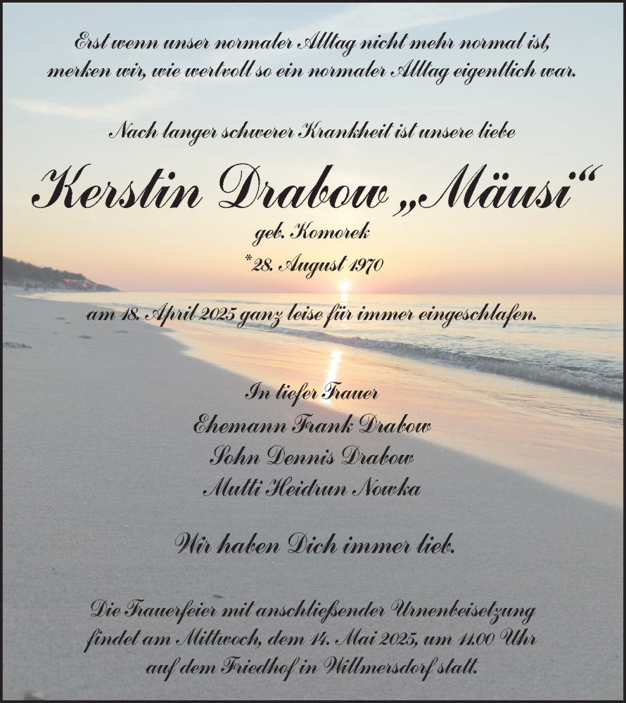 Hier finden Sie alle Traueranzeigen aus der Zeitung, die bisher für Kerstin Drabow erschienen sind. Weitere Traueranzeigen, die in der Zeitung erscheinen, werden hier ebenfalls aufgelistet