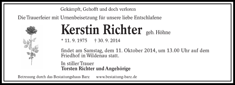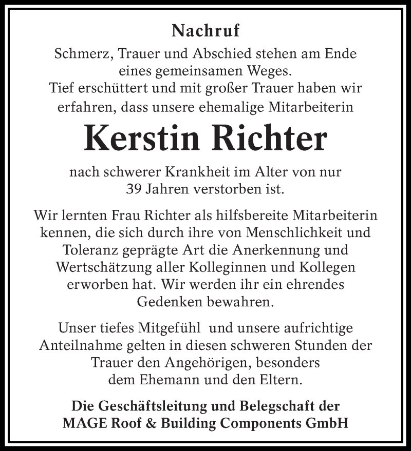 Hier finden Sie alle Traueranzeigen aus der Zeitung, die bisher für Kerstin Richter erschienen sind. Weitere Traueranzeigen, die in der Zeitung erscheinen, werden hier ebenfalls aufgelistet
