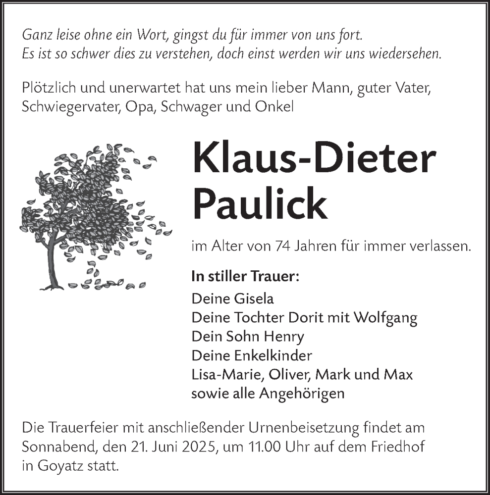 Hier finden Sie alle Traueranzeigen aus der Zeitung, die bisher für Klaus-Dieter Paulick erschienen sind. Weitere Traueranzeigen, die in der Zeitung erscheinen, werden hier ebenfalls aufgelistet