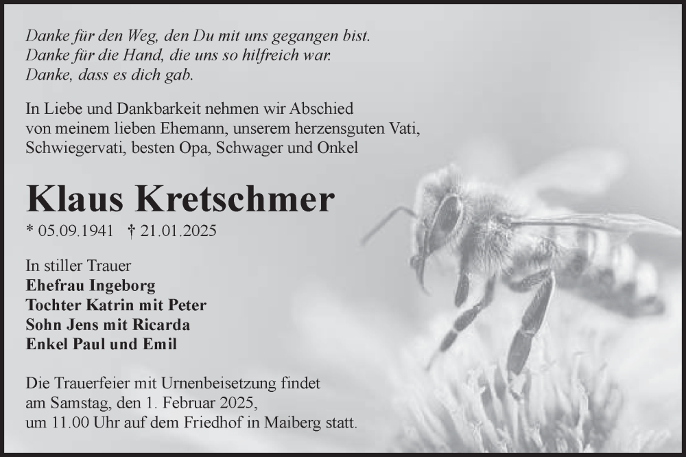 Hier finden Sie alle Traueranzeigen aus der Zeitung, die bisher für Klaus Kretschmer erschienen sind. Weitere Traueranzeigen, die in der Zeitung erscheinen, werden hier ebenfalls aufgelistet