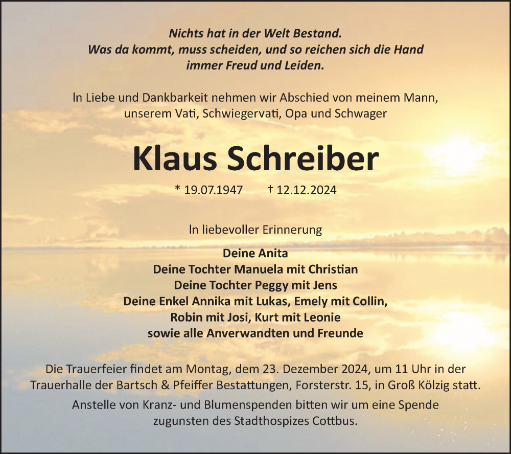Hier finden Sie alle Traueranzeigen aus der Zeitung, die bisher für Klaus Schreiber erschienen sind. Weitere Traueranzeigen, die in der Zeitung erscheinen, werden hier ebenfalls aufgelistet
