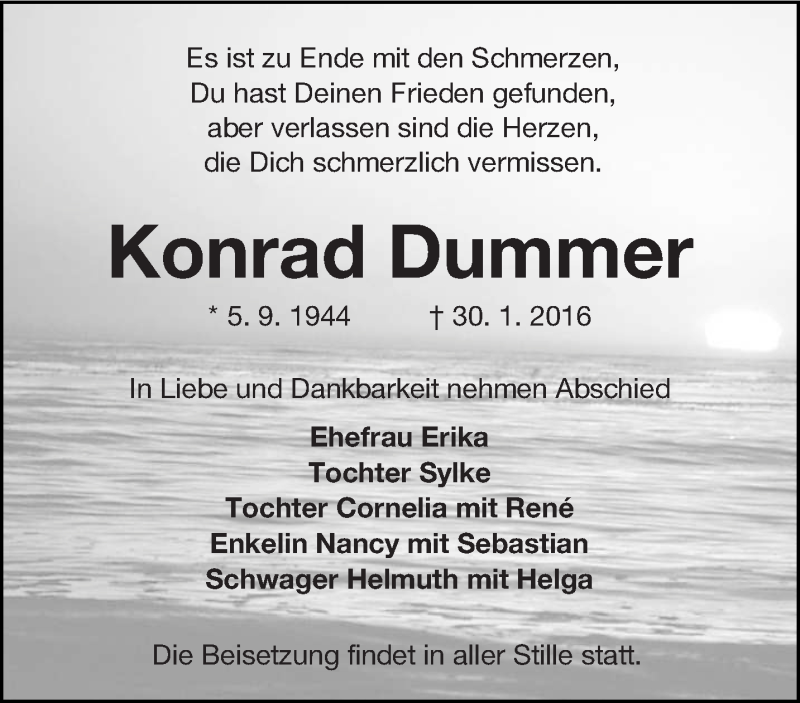 Hier finden Sie alle Traueranzeigen aus der Zeitung, die bisher für Konrad Dummer erschienen sind. Weitere Traueranzeigen, die in der Zeitung erscheinen, werden hier ebenfalls aufgelistet