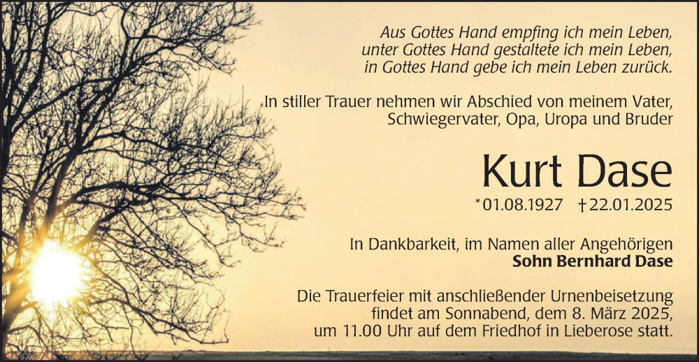 Hier finden Sie alle Traueranzeigen aus der Zeitung, die bisher für Kurt Dase erschienen sind. Weitere Traueranzeigen, die in der Zeitung erscheinen, werden hier ebenfalls aufgelistet