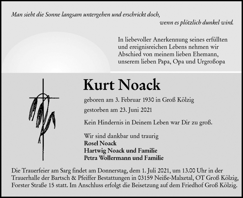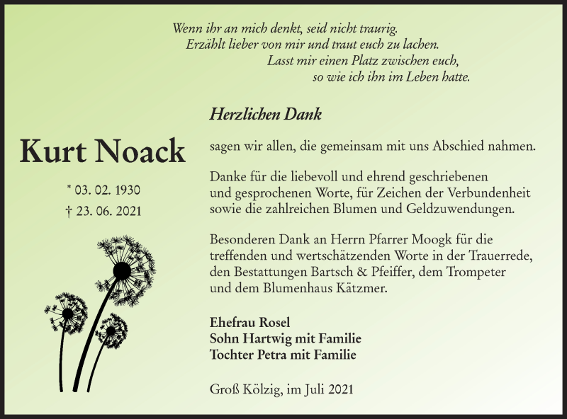 Hier finden Sie alle Traueranzeigen aus der Zeitung, die bisher für Kurt Noack erschienen sind. Weitere Traueranzeigen, die in der Zeitung erscheinen, werden hier ebenfalls aufgelistet