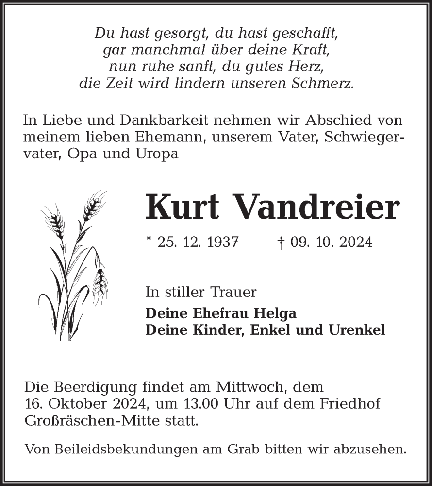 Hier finden Sie alle Traueranzeigen aus der Zeitung, die bisher für Kurt Vandreier erschienen sind. Weitere Traueranzeigen, die in der Zeitung erscheinen, werden hier ebenfalls aufgelistet