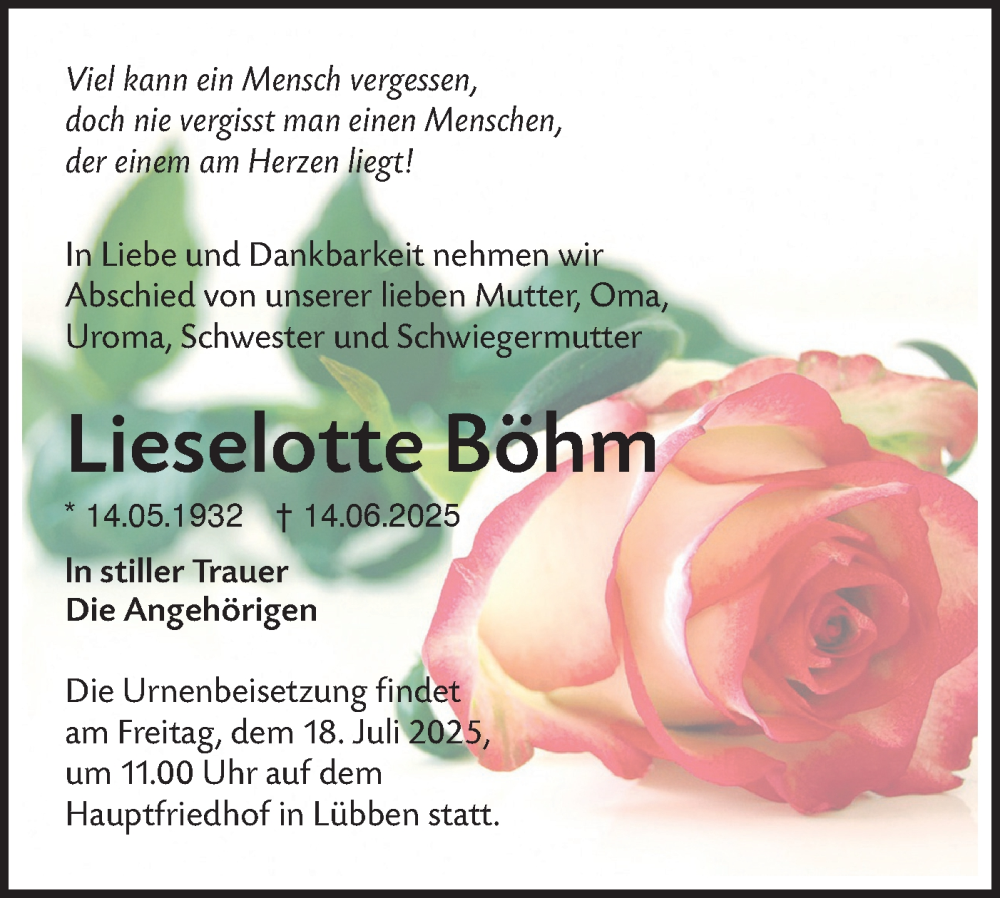 Hier finden Sie alle Traueranzeigen aus der Zeitung, die bisher für Lieselotte Böhm erschienen sind. Weitere Traueranzeigen, die in der Zeitung erscheinen, werden hier ebenfalls aufgelistet