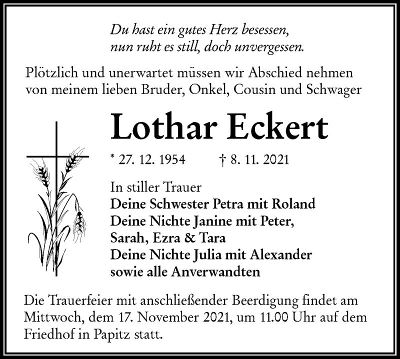 Hier finden Sie alle Traueranzeigen aus der Zeitung, die bisher für Lothar Eckert erschienen sind. Weitere Traueranzeigen, die in der Zeitung erscheinen, werden hier ebenfalls aufgelistet