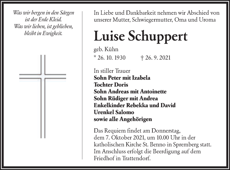 Hier finden Sie alle Traueranzeigen aus der Zeitung, die bisher für Luise Schuppert erschienen sind. Weitere Traueranzeigen, die in der Zeitung erscheinen, werden hier ebenfalls aufgelistet