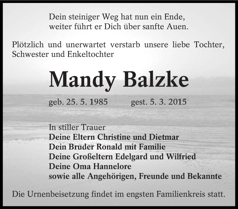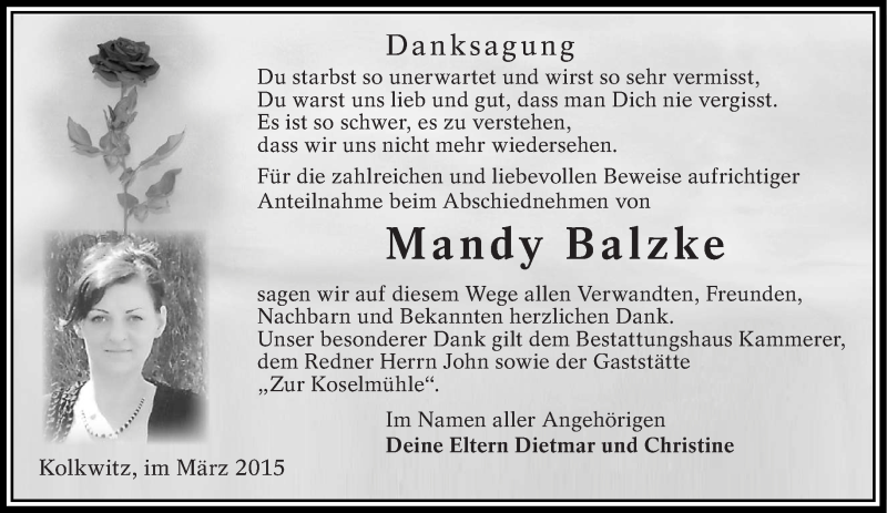 Hier finden Sie alle Traueranzeigen aus der Zeitung, die bisher für Mandy Balzke erschienen sind. Weitere Traueranzeigen, die in der Zeitung erscheinen, werden hier ebenfalls aufgelistet