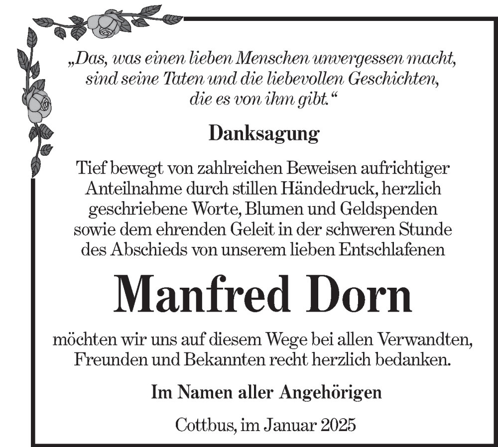 Hier finden Sie alle Traueranzeigen aus der Zeitung, die bisher für Manfred Dorn erschienen sind. Weitere Traueranzeigen, die in der Zeitung erscheinen, werden hier ebenfalls aufgelistet