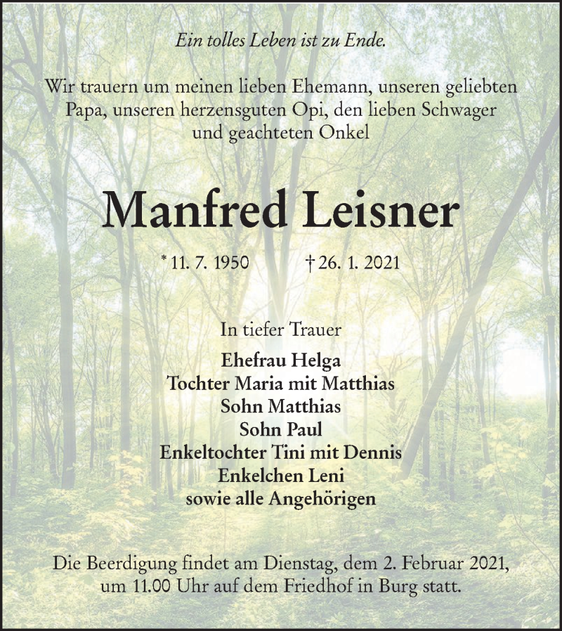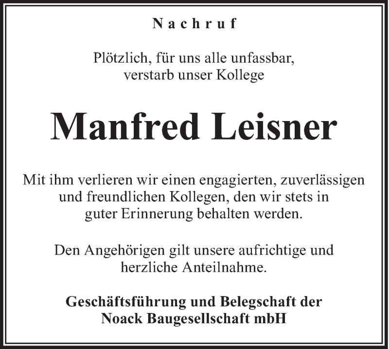 Hier finden Sie alle Traueranzeigen aus der Zeitung, die bisher für Manfred Leisner erschienen sind. Weitere Traueranzeigen, die in der Zeitung erscheinen, werden hier ebenfalls aufgelistet