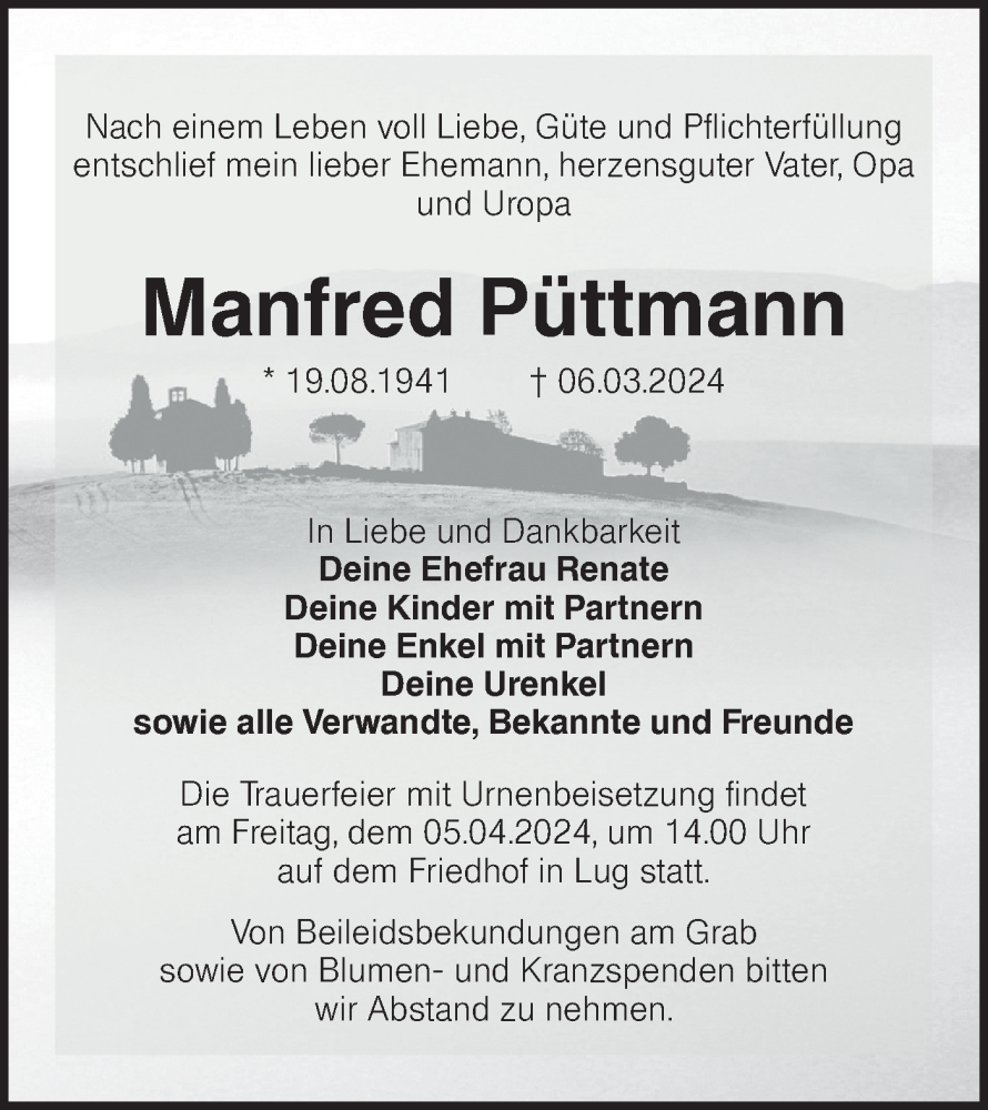Hier finden Sie alle Traueranzeigen aus der Zeitung, die bisher für Manfred Püttmann erschienen sind. Weitere Traueranzeigen, die in der Zeitung erscheinen, werden hier ebenfalls aufgelistet