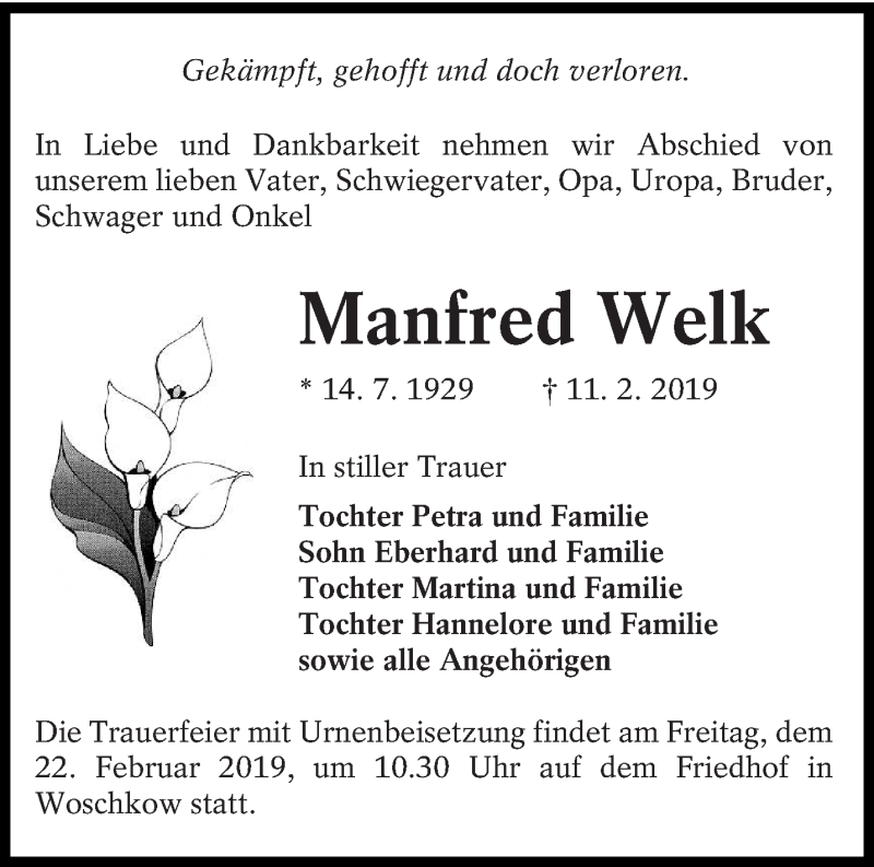 Hier finden Sie alle Traueranzeigen aus der Zeitung, die bisher für Manfred Welk erschienen sind. Weitere Traueranzeigen, die in der Zeitung erscheinen, werden hier ebenfalls aufgelistet