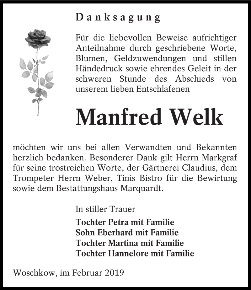 Hier finden Sie alle Traueranzeigen aus der Zeitung, die bisher für Manfred Welk erschienen sind. Weitere Traueranzeigen, die in der Zeitung erscheinen, werden hier ebenfalls aufgelistet