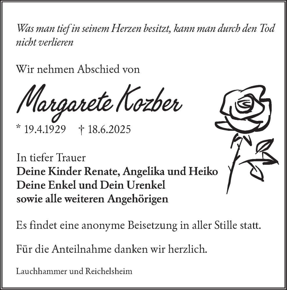 Hier finden Sie alle Traueranzeigen aus der Zeitung, die bisher für Margarete Kozber erschienen sind. Weitere Traueranzeigen, die in der Zeitung erscheinen, werden hier ebenfalls aufgelistet