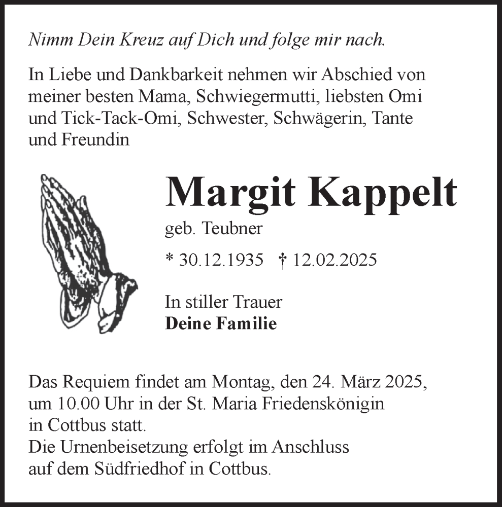 Hier finden Sie alle Traueranzeigen aus der Zeitung, die bisher für Margit Kappelt erschienen sind. Weitere Traueranzeigen, die in der Zeitung erscheinen, werden hier ebenfalls aufgelistet