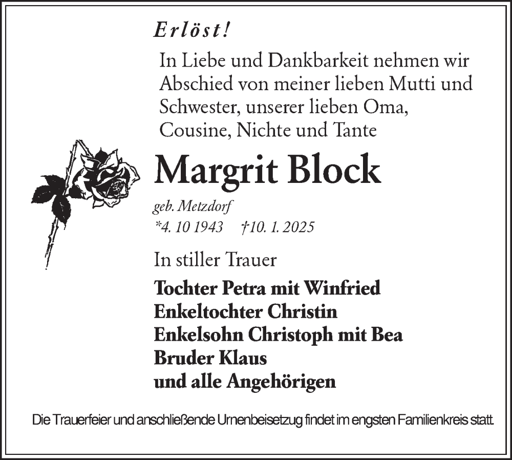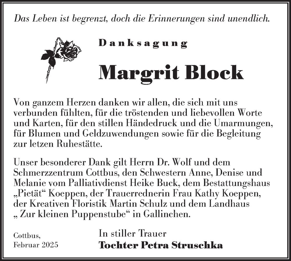 Hier finden Sie alle Traueranzeigen aus der Zeitung, die bisher für Margrit Block erschienen sind. Weitere Traueranzeigen, die in der Zeitung erscheinen, werden hier ebenfalls aufgelistet