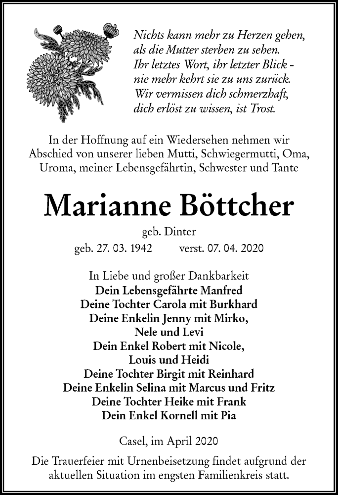 Hier finden Sie alle Traueranzeigen aus der Zeitung, die bisher für Marianne Böttcher erschienen sind. Weitere Traueranzeigen, die in der Zeitung erscheinen, werden hier ebenfalls aufgelistet