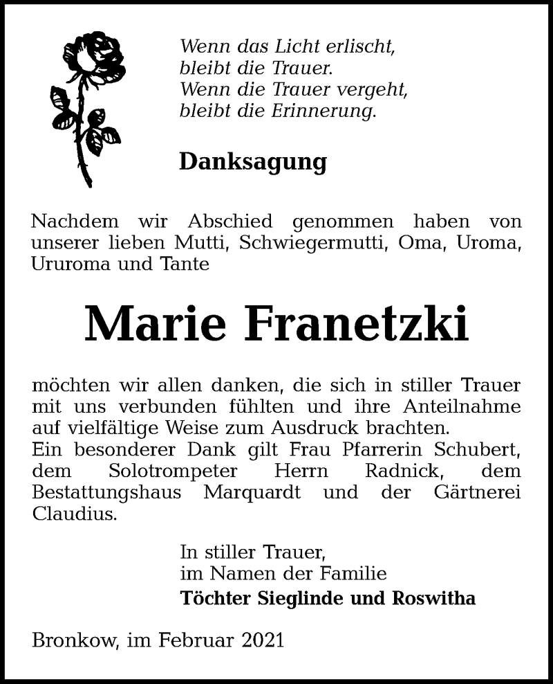 Hier finden Sie alle Traueranzeigen aus der Zeitung, die bisher für Marie Franetzki erschienen sind. Weitere Traueranzeigen, die in der Zeitung erscheinen, werden hier ebenfalls aufgelistet
