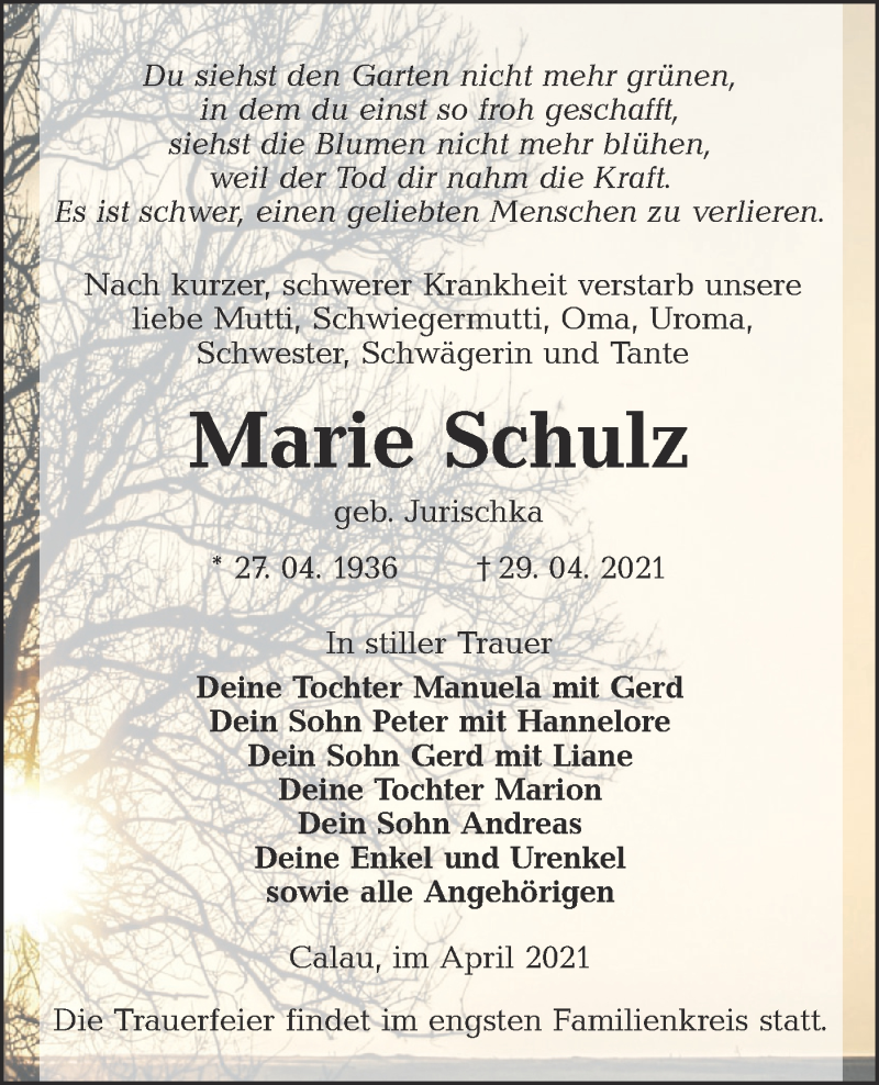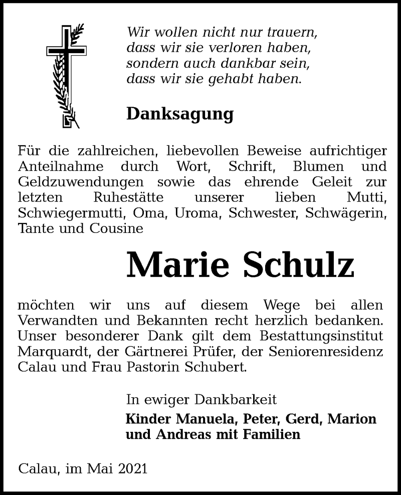 Hier finden Sie alle Traueranzeigen aus der Zeitung, die bisher für Marie Schulz erschienen sind. Weitere Traueranzeigen, die in der Zeitung erscheinen, werden hier ebenfalls aufgelistet