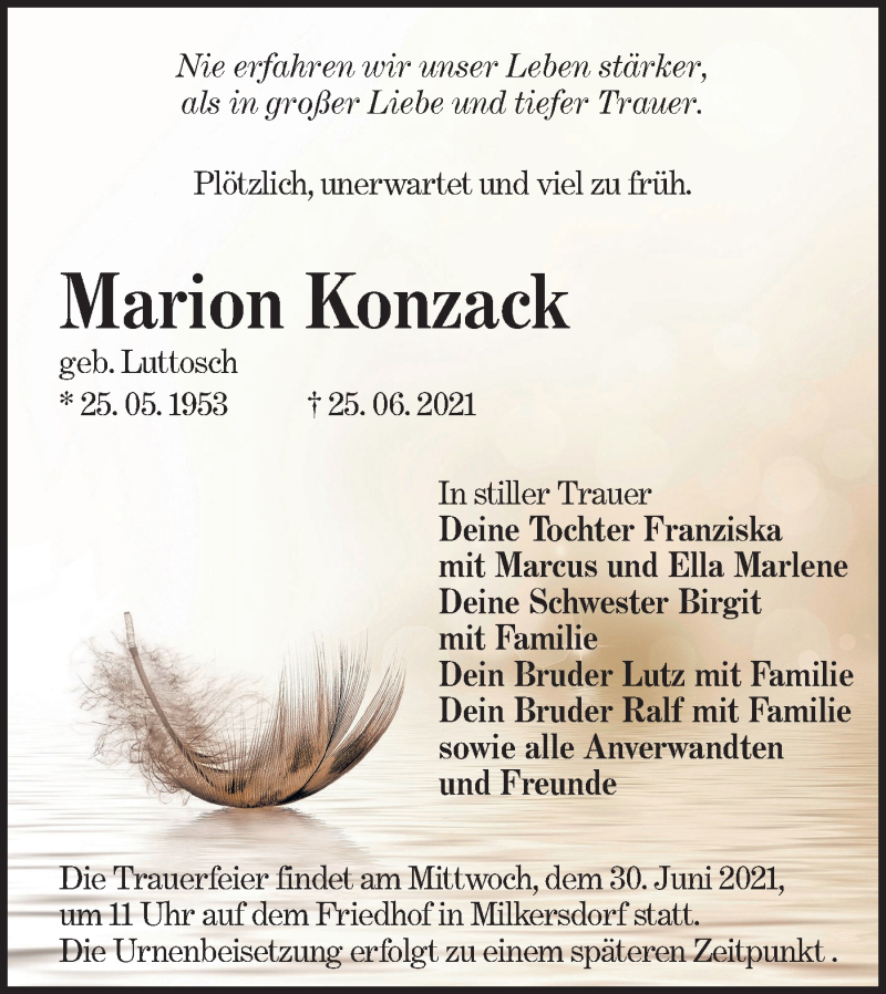 Hier finden Sie alle Traueranzeigen aus der Zeitung, die bisher für Marion Konzack erschienen sind. Weitere Traueranzeigen, die in der Zeitung erscheinen, werden hier ebenfalls aufgelistet