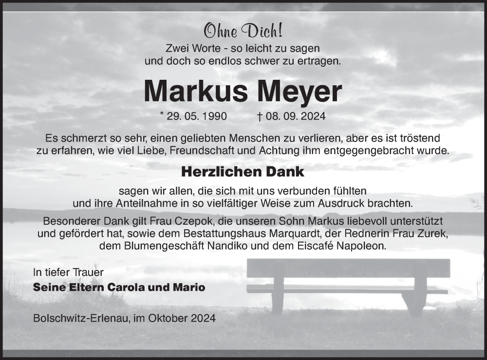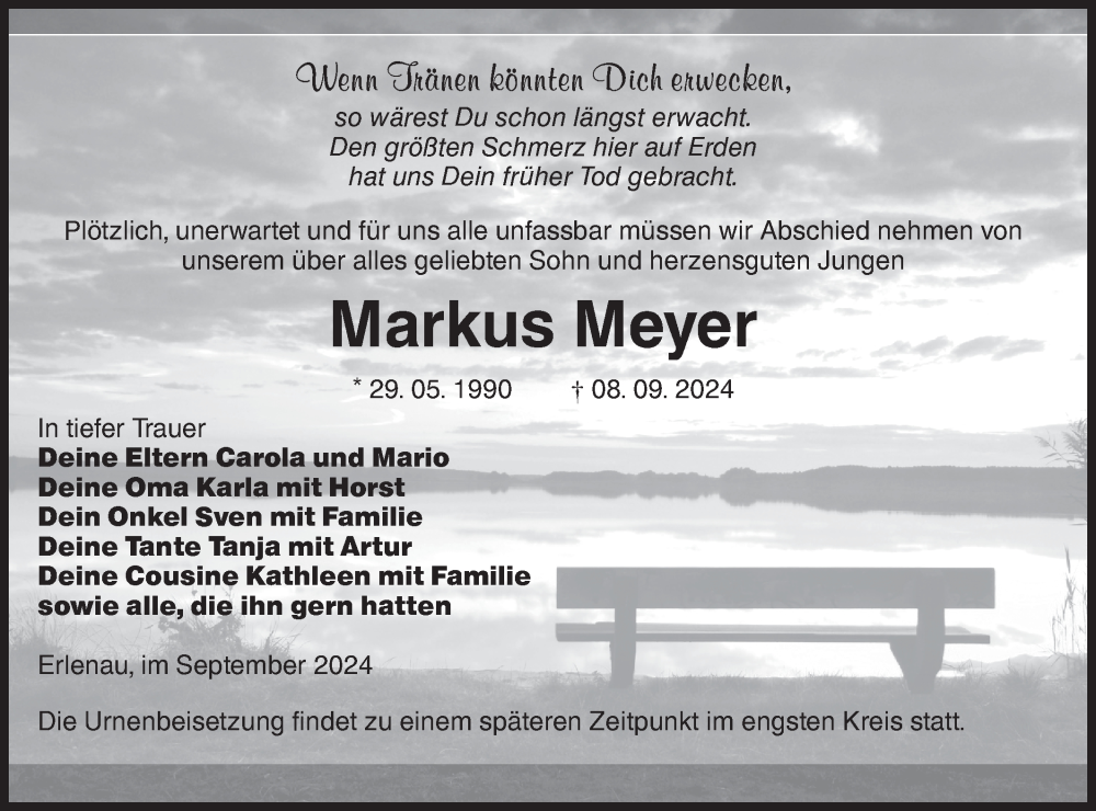 Hier finden Sie alle Traueranzeigen aus der Zeitung, die bisher für Markus Meyer erschienen sind. Weitere Traueranzeigen, die in der Zeitung erscheinen, werden hier ebenfalls aufgelistet