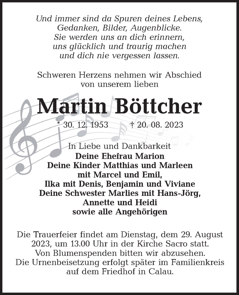 Hier finden Sie alle Traueranzeigen aus der Zeitung, die bisher für Martin Böttcher erschienen sind. Weitere Traueranzeigen, die in der Zeitung erscheinen, werden hier ebenfalls aufgelistet