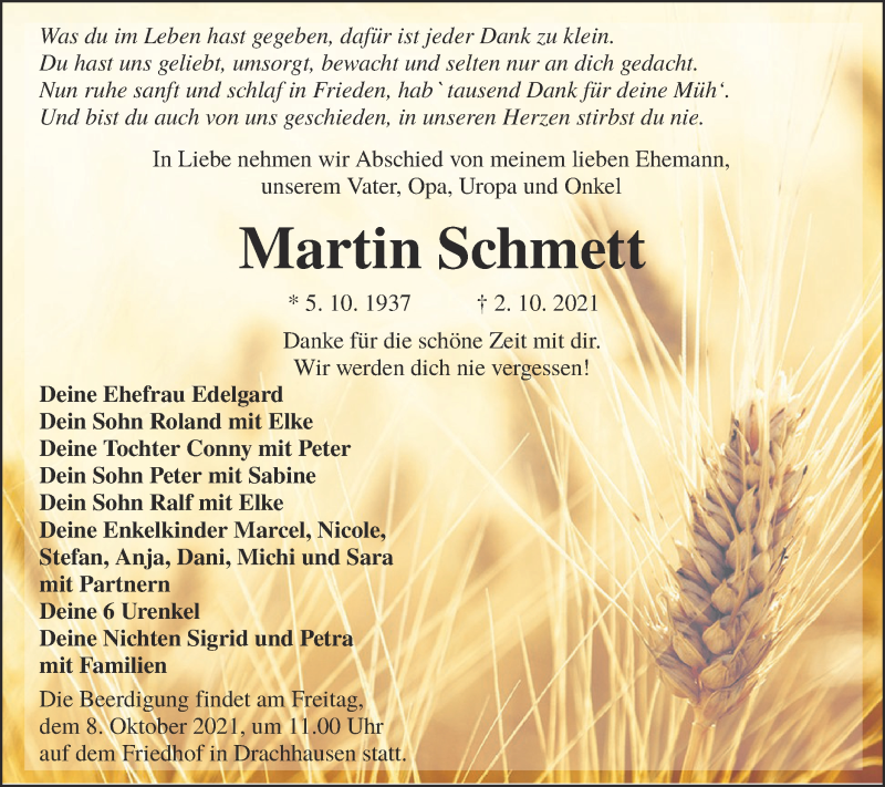 Hier finden Sie alle Traueranzeigen aus der Zeitung, die bisher für Martin Schmet erschienen sind. Weitere Traueranzeigen, die in der Zeitung erscheinen, werden hier ebenfalls aufgelistet