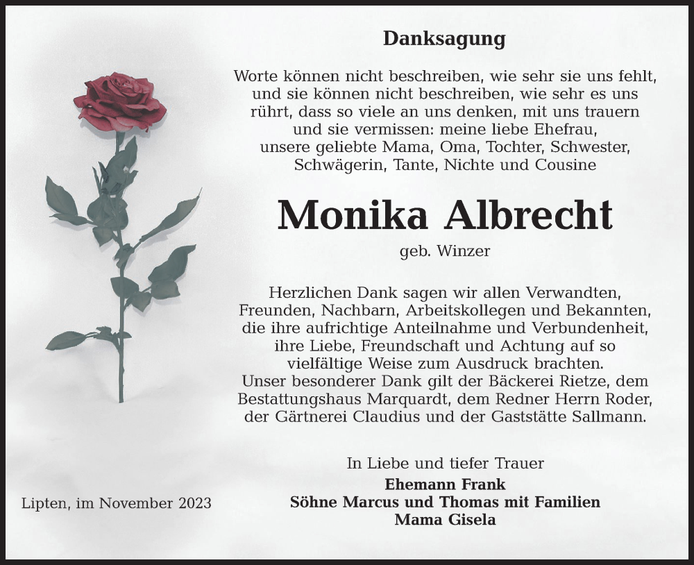Hier finden Sie alle Traueranzeigen aus der Zeitung, die bisher für Monika Albrecht erschienen sind. Weitere Traueranzeigen, die in der Zeitung erscheinen, werden hier ebenfalls aufgelistet
