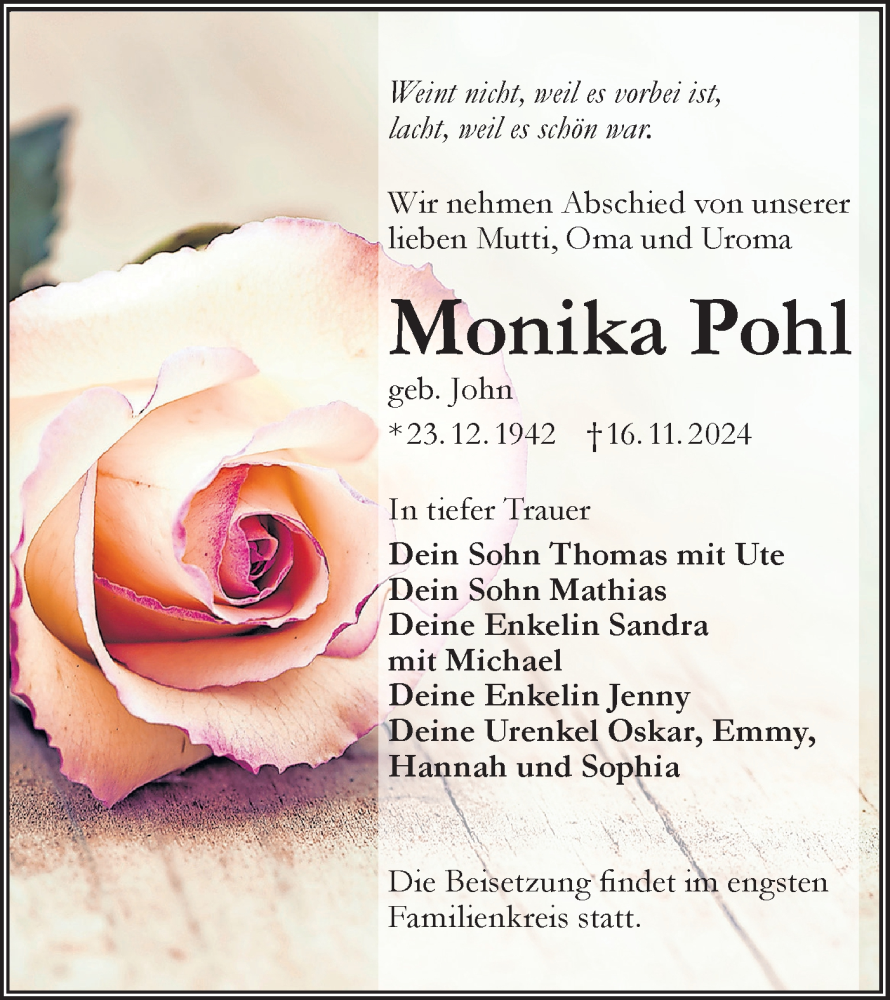 Hier finden Sie alle Traueranzeigen aus der Zeitung, die bisher für Monika Pohl erschienen sind. Weitere Traueranzeigen, die in der Zeitung erscheinen, werden hier ebenfalls aufgelistet