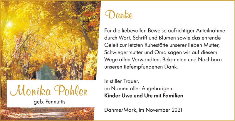 Hier finden Sie alle Traueranzeigen aus der Zeitung, die bisher für Monika Pohler erschienen sind. Weitere Traueranzeigen, die in der Zeitung erscheinen, werden hier ebenfalls aufgelistet