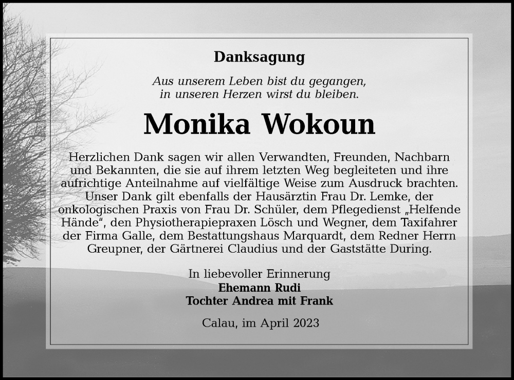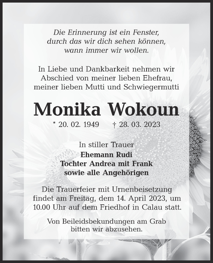 Hier finden Sie alle Traueranzeigen aus der Zeitung, die bisher für Monika Wokoun erschienen sind. Weitere Traueranzeigen, die in der Zeitung erscheinen, werden hier ebenfalls aufgelistet