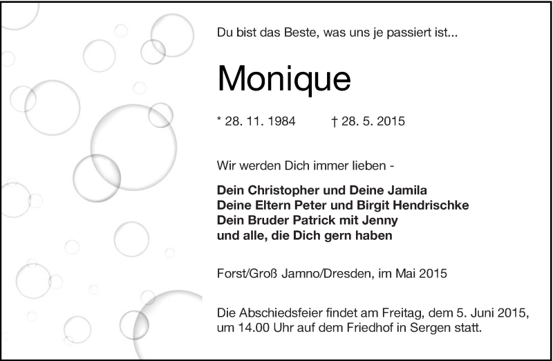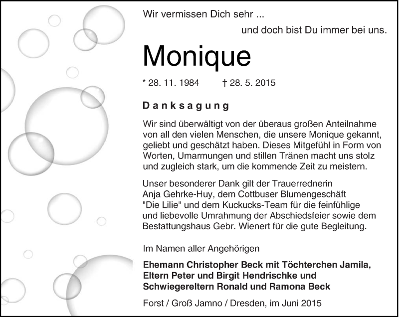 Hier finden Sie alle Traueranzeigen aus der Zeitung, die bisher für Monique erschienen sind. Weitere Traueranzeigen, die in der Zeitung erscheinen, werden hier ebenfalls aufgelistet