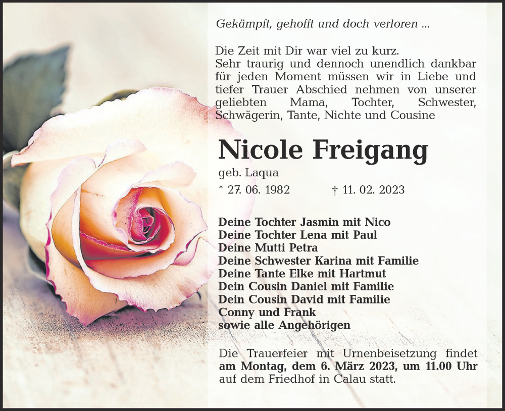Hier finden Sie alle Traueranzeigen aus der Zeitung, die bisher für Nicole Freigang erschienen sind. Weitere Traueranzeigen, die in der Zeitung erscheinen, werden hier ebenfalls aufgelistet