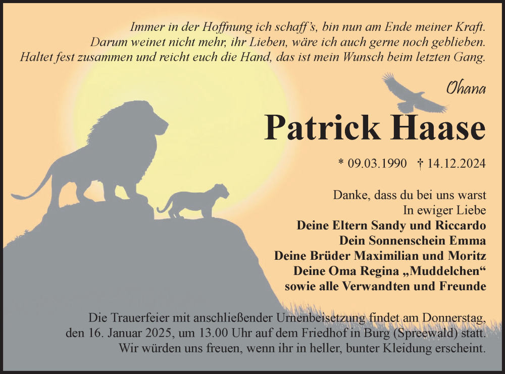 Hier finden Sie alle Traueranzeigen aus der Zeitung, die bisher für Patrick Haase erschienen sind. Weitere Traueranzeigen, die in der Zeitung erscheinen, werden hier ebenfalls aufgelistet