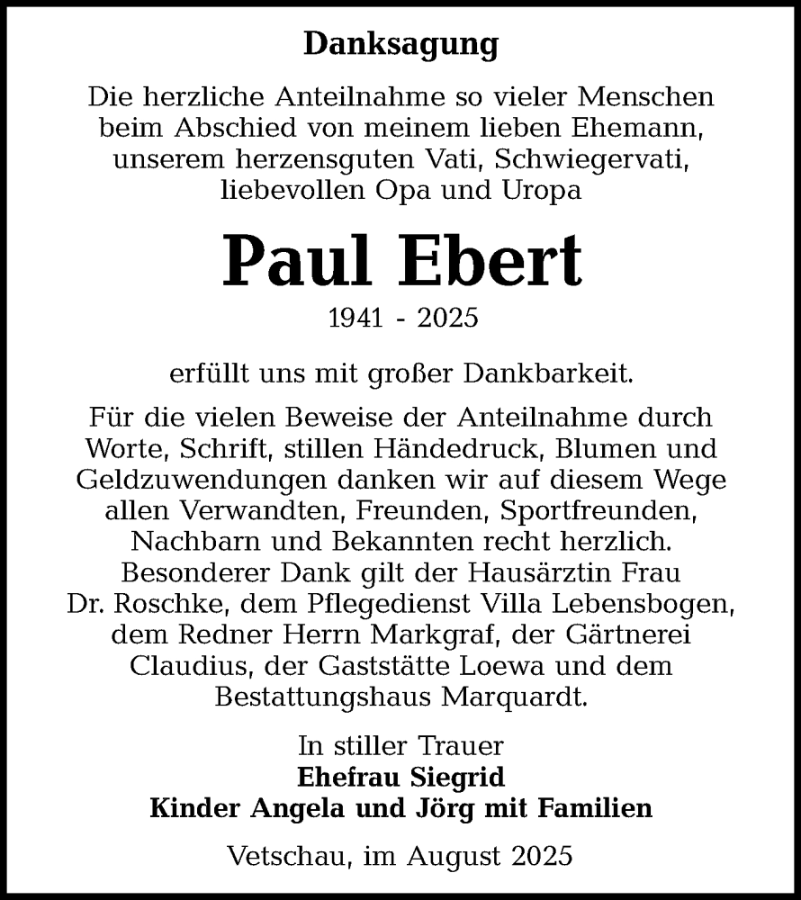 Hier finden Sie alle Traueranzeigen aus der Zeitung, die bisher für Paul Ebert erschienen sind. Weitere Traueranzeigen, die in der Zeitung erscheinen, werden hier ebenfalls aufgelistet